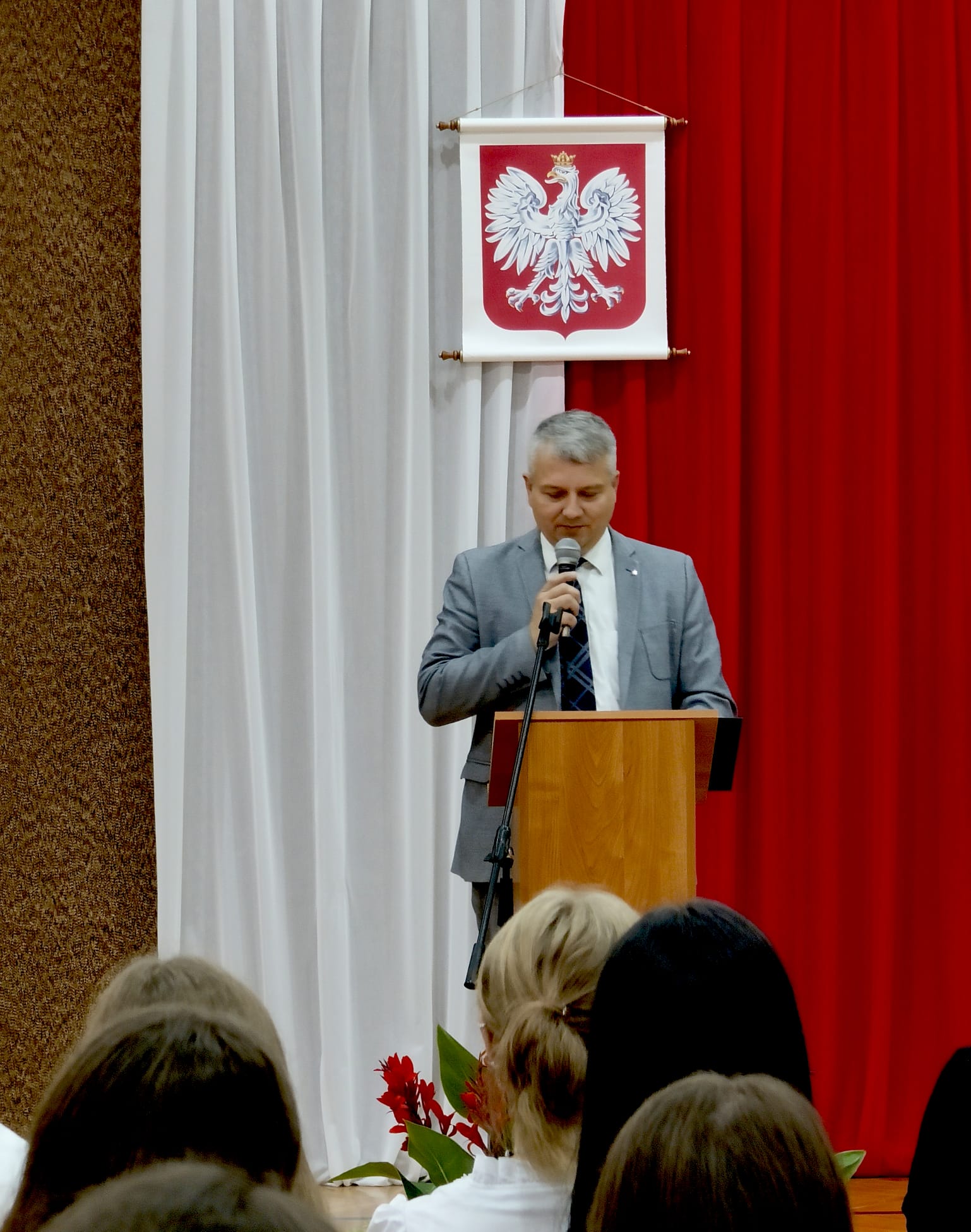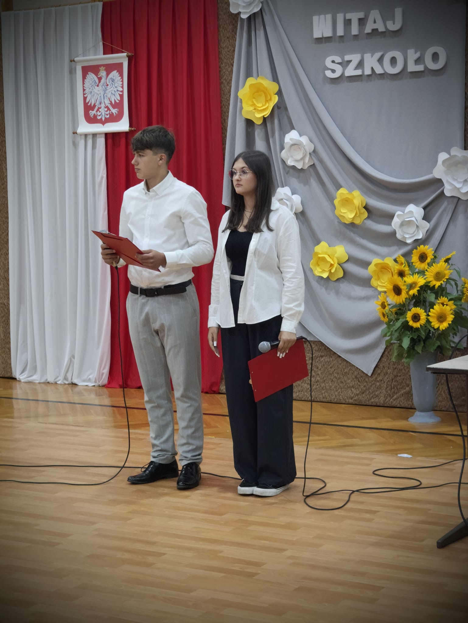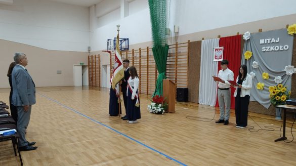 Dyrektor szkoły serdecznie powitał uczniów, nauczycieli, pracowników oraz rodziców, wyrażając radość z powrotu po wakacjach i nadzieję na owocny rok pełen wiedzy i rozwoju. Szczególne słowa skierował do uczniów klas pierwszych, podkreślając ich ważną rolę w społeczności szkolnej, a także powitał uczniów klas drugiej, trzecich, czwartych i piątych. Przywitał również pięciu nowych nauczycieli – języka angielskiego, języka niemieckiego, informatyki oraz matematyki.