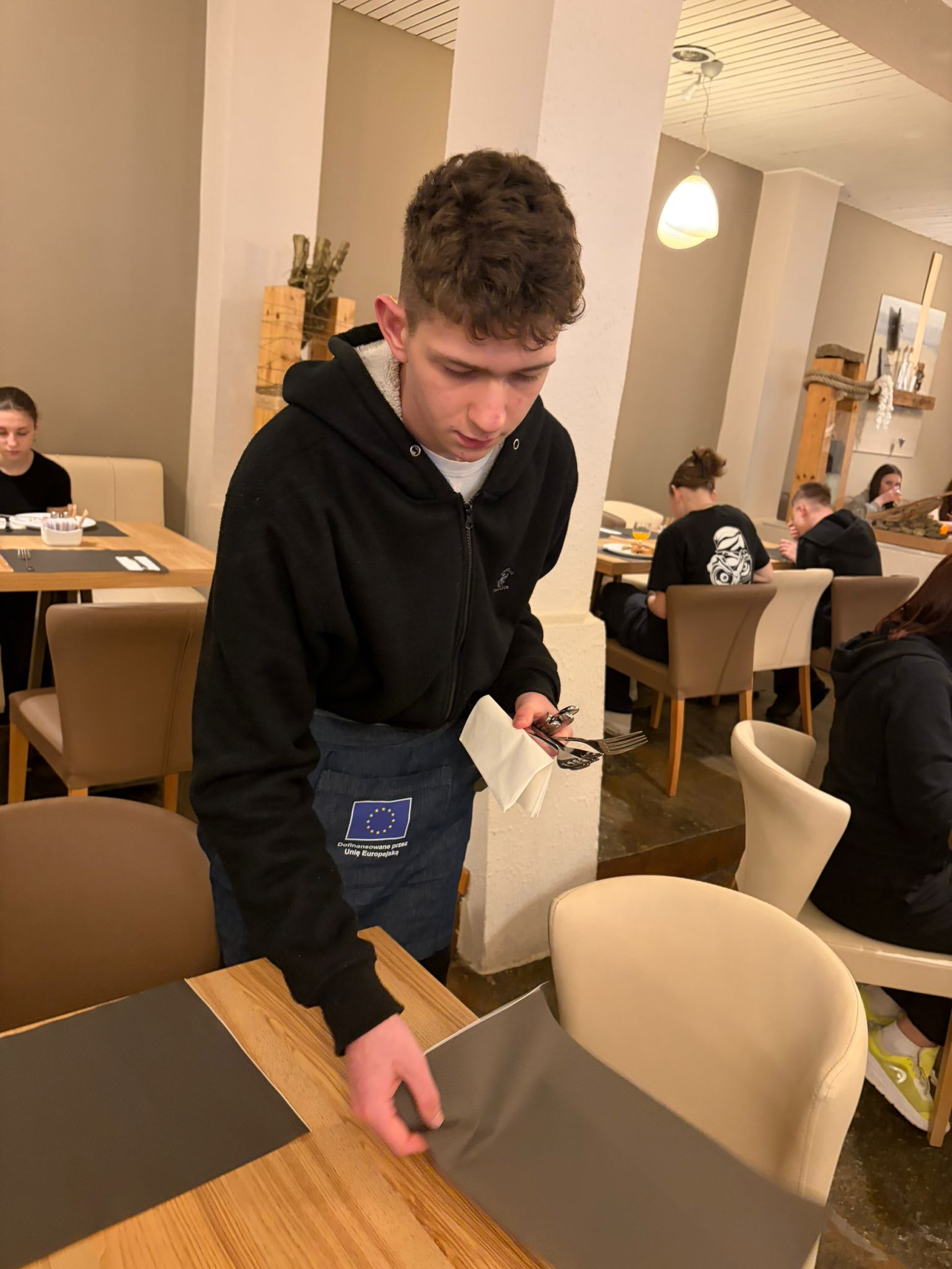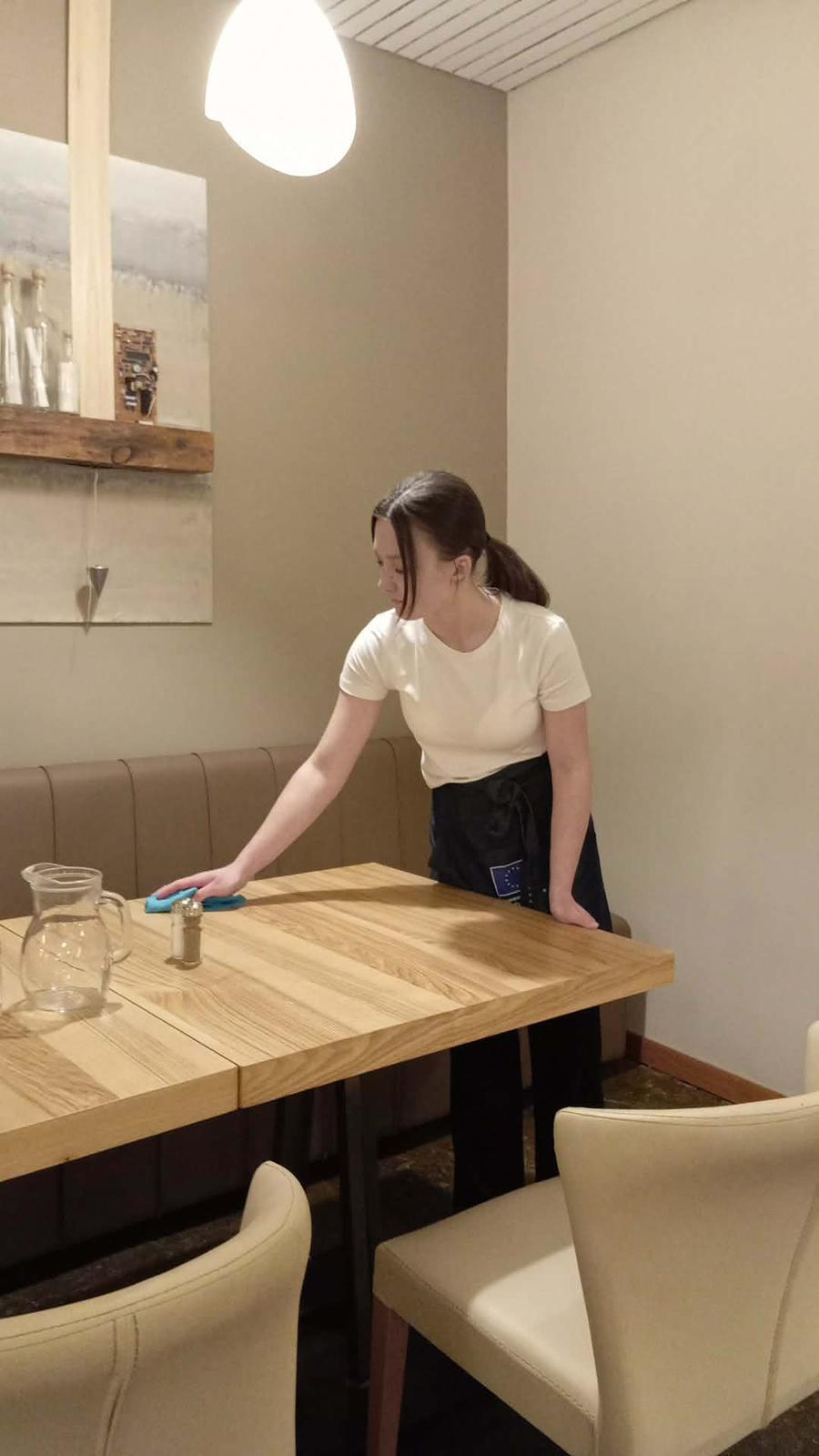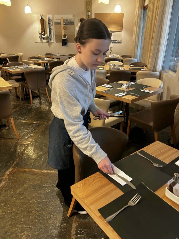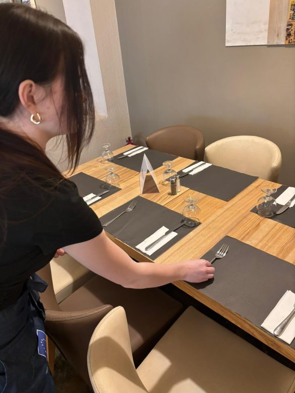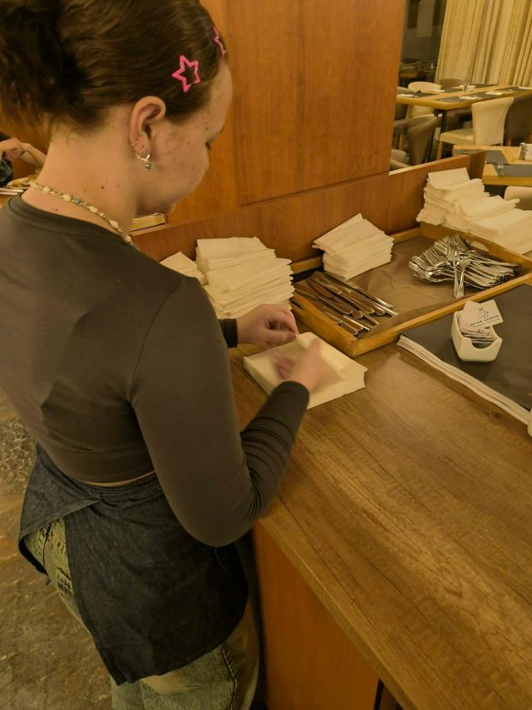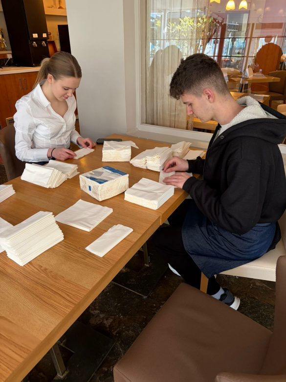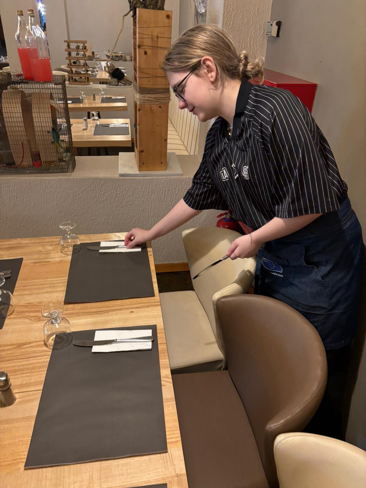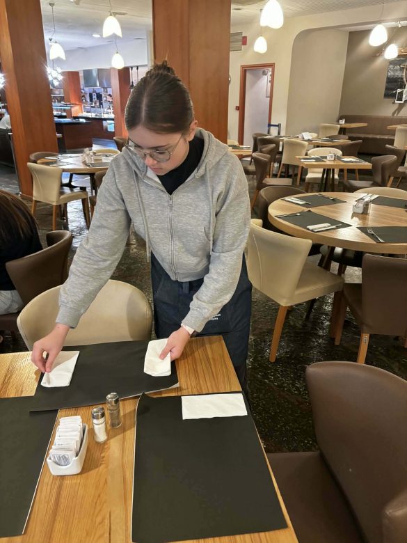 W trakcie praktyk uczniowie rozwijali także umiejętności związane z obsługą konsumenta. Uczyli się przygotowywać sale restauracyjne na przyjęcie gości, projektowali i wykonywali różne rodzaje nakryć stołów na przyjęcia okolicznościowe oraz dobierali odpowiednią zastawę i bieliznę stołową do charakteru wydarzenia.