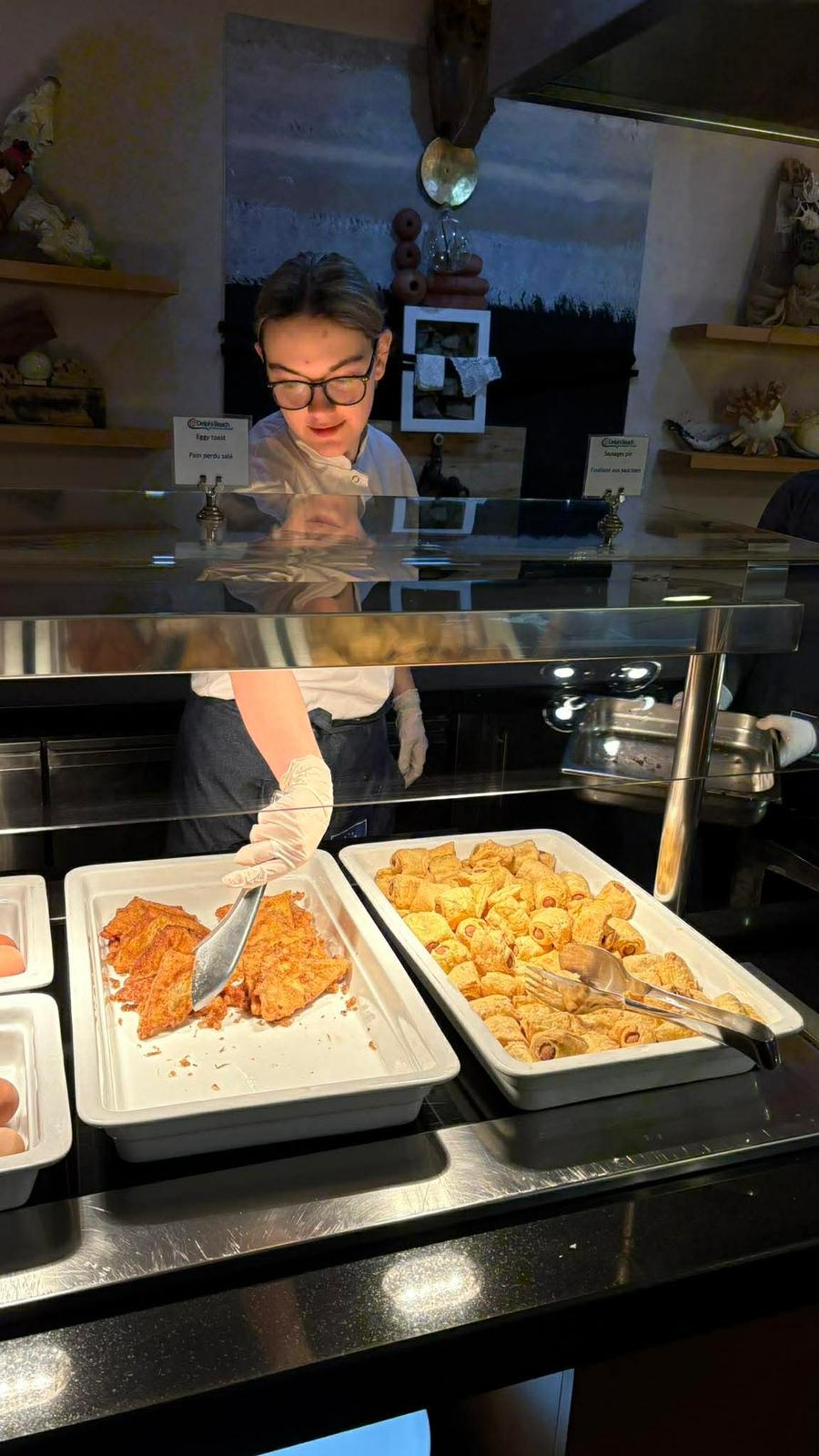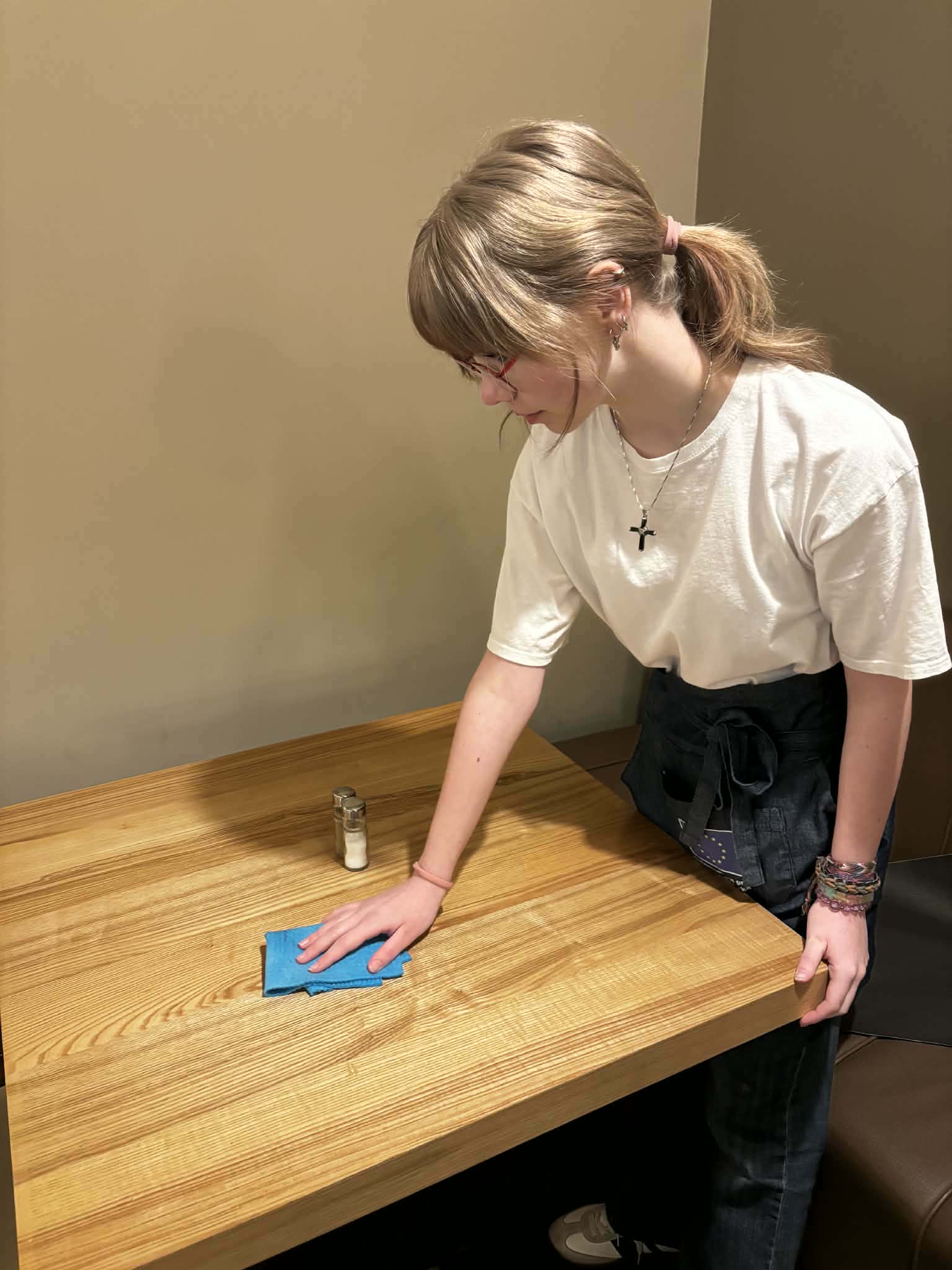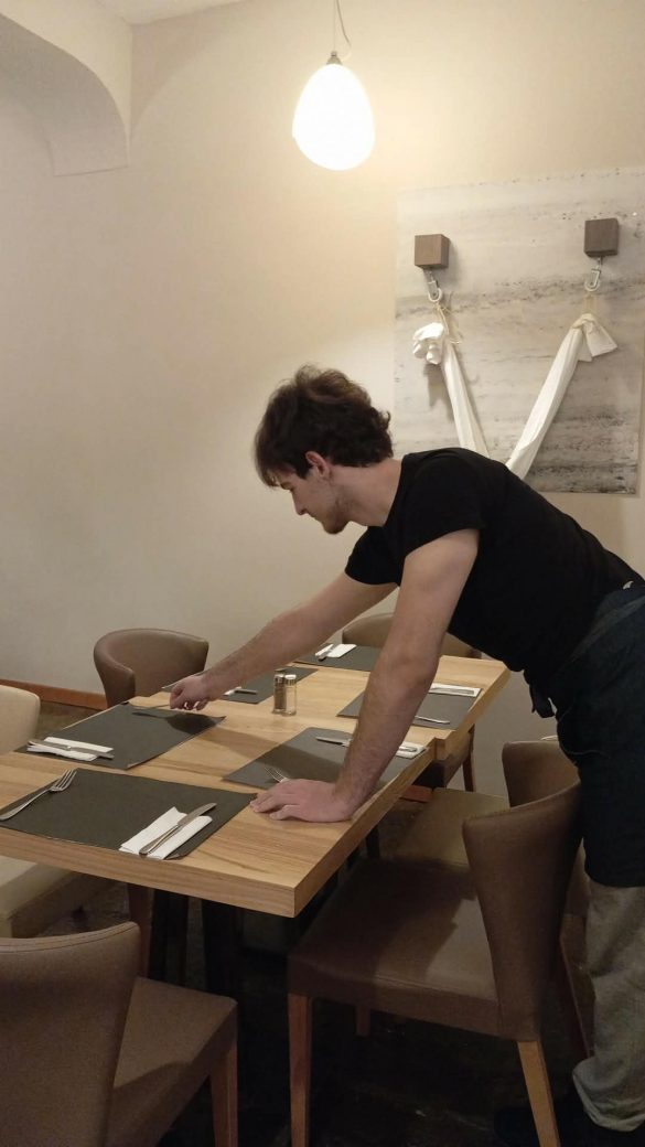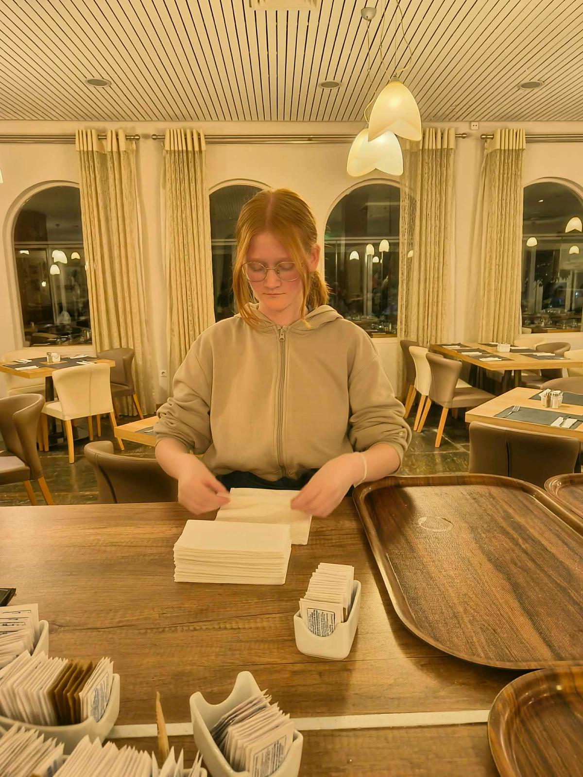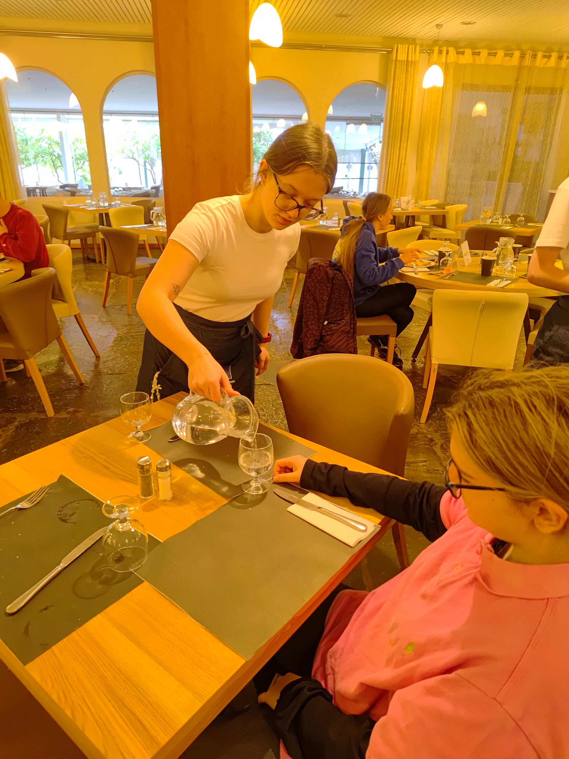 W trakcie praktyk uczniowie rozwijali także umiejętności związane z obsługą konsumenta. Uczyli się przygotowywać sale restauracyjne na przyjęcie gości, projektowali i wykonywali różne rodzaje nakryć stołów na przyjęcia okolicznościowe oraz dobierali odpowiednią zastawę i bieliznę stołową do charakteru wydarzenia.